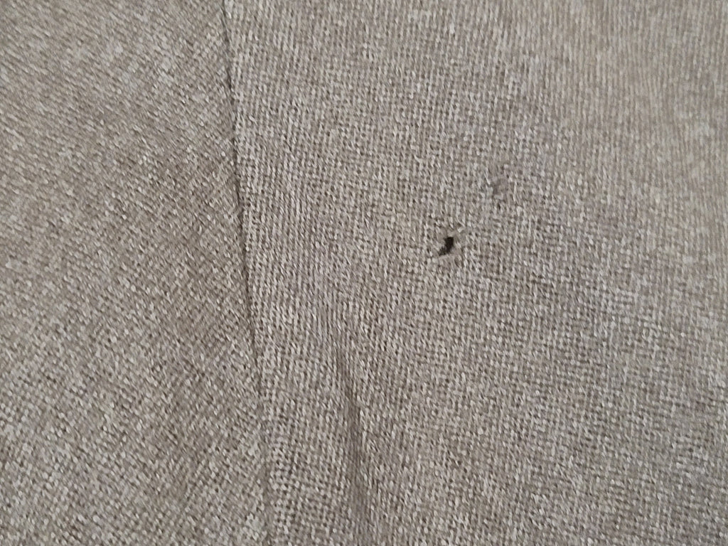OK condition with flaws. Small moth holes and some wear on the fold lines. Some smudges on the bottom of the skirt.
