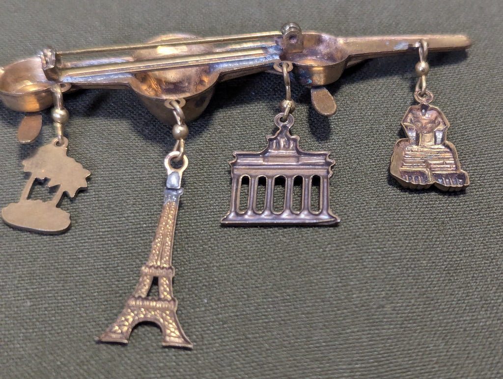 Original plane pin with charms. The airplane looks like a B-25 Mitchell bomber (or maybe a Douglas A-20) which was active in all theaters of the war. It has charms from various places the army was - including Berlin! Sphinx for the Africa campaign, Brandenburg Gate for Berlin, Eifel Tower for Paris, palm trees for the Island campaigns and the Taj Mahal for the CBI theater. Decent condition with some wear and discoloration.
