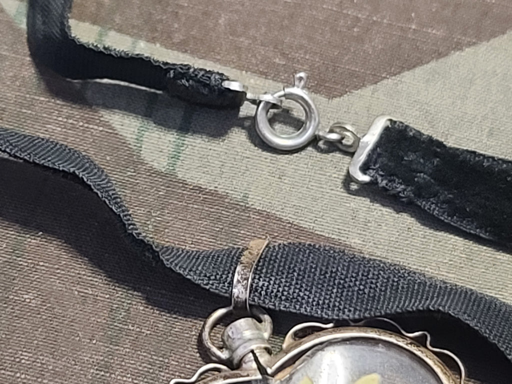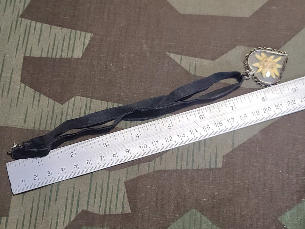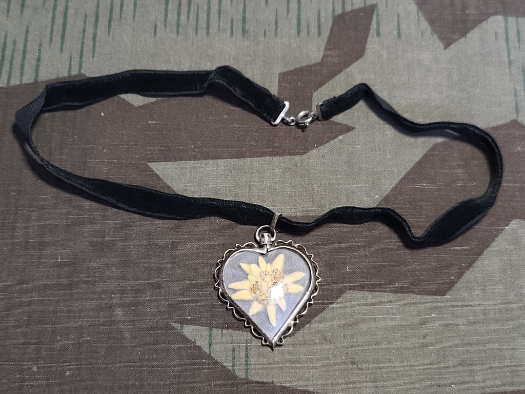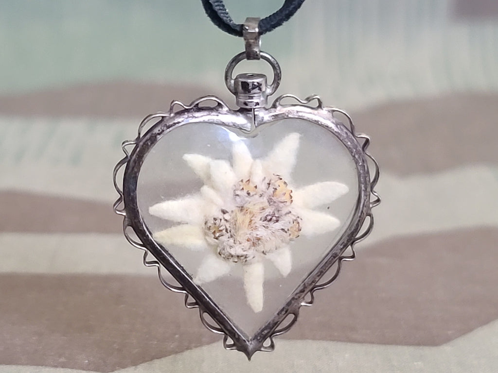 Vintage heart shaped edelweiss pendant necklace from Germany. Real edelweiss flower charm on a velvet choker type necklace. Marked 835 silver on the clasp. Some discoloration / tarnishing on the clasp and on the charm itself. Some wear on the velvet material.