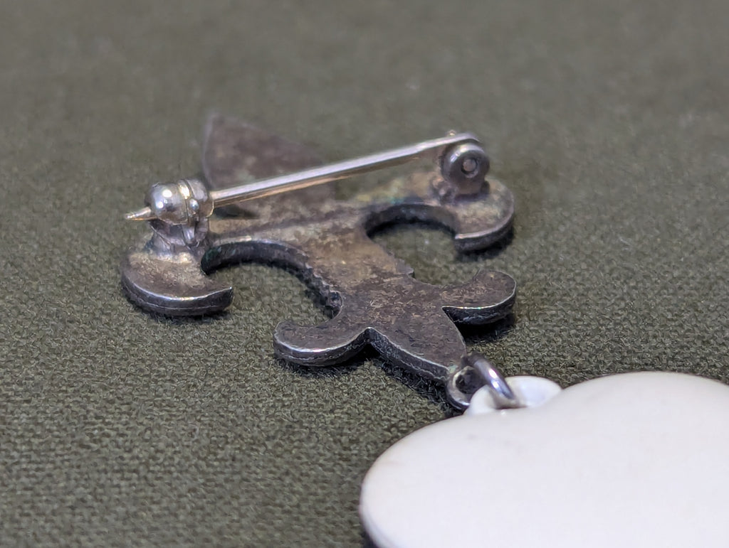 Vintage paratrooper sweetheart pin. Enamel fleur-de-lis pin with dangling heart with Airborne jump wings insignia. Painted rose at the top of the fleur-de-lis. There is a chip in the enamel. General light wear and tarnishing. The fleur-de-lis is a symbol of France so this is the perfect sweetheart piece for the Normandy campaign. Nice unique brooch.