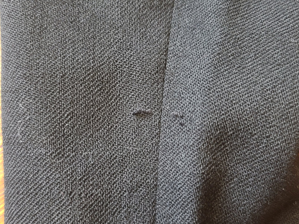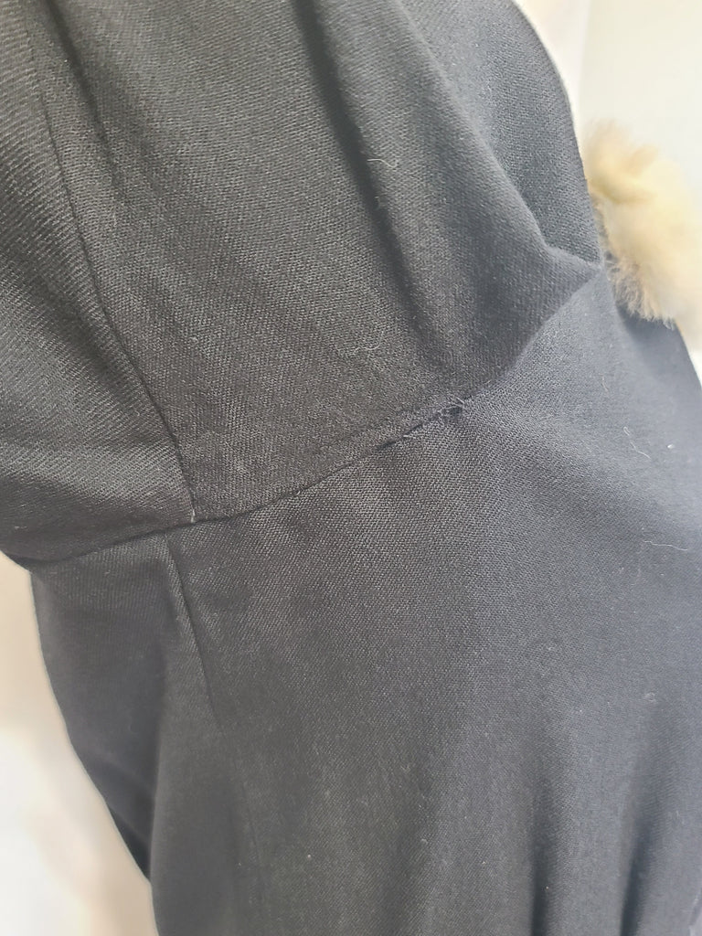 I believe the fur trim is rabbit. It is quite soft. Pleated peplum at the waist. Sewn in shoulder pads. Snaps at the side. Overall good condition. Some light wear and small repairs under the arms. A few pulls in the material. Some creasing around the elbow.