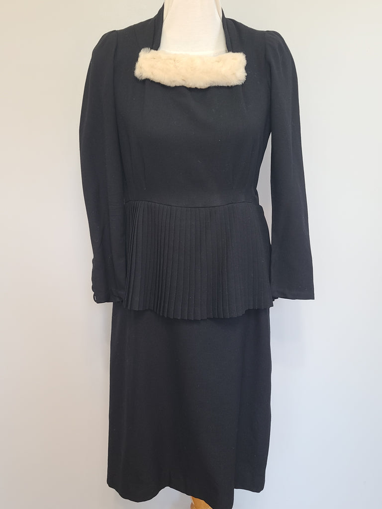 Vintage 1930s / 1940s German black wool dress with fur trim.