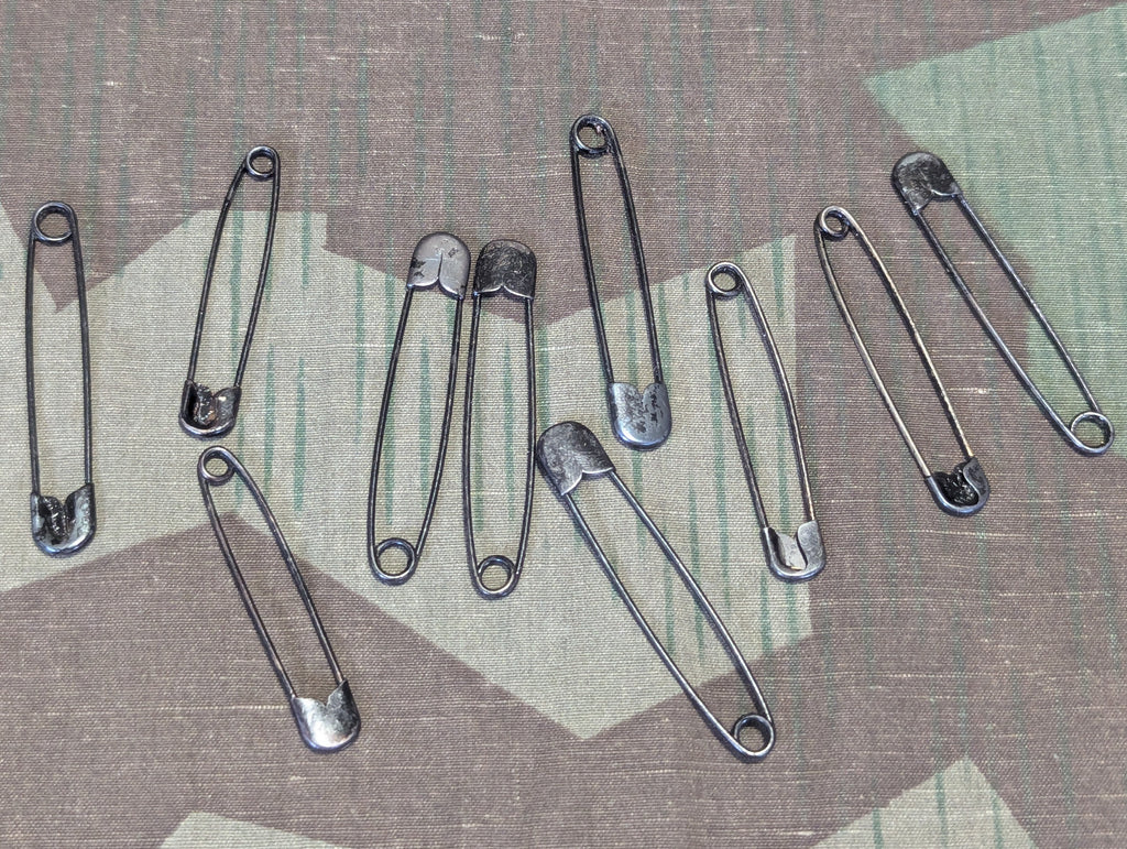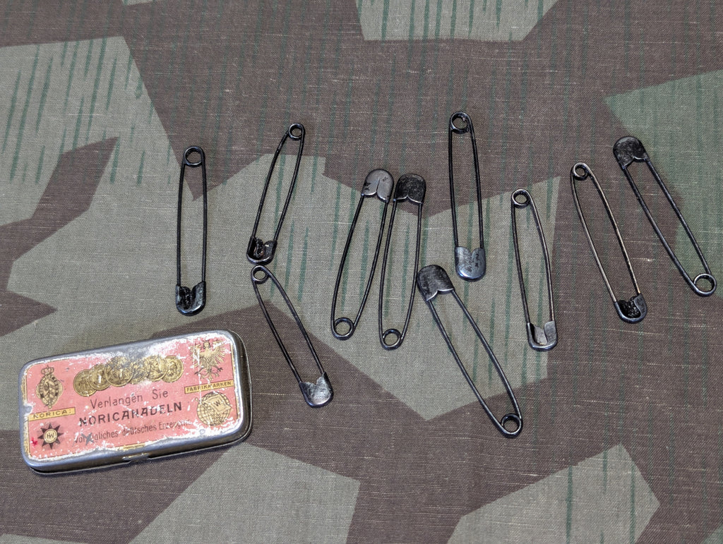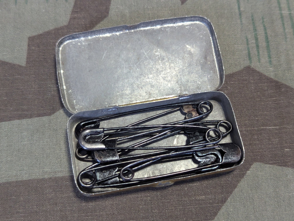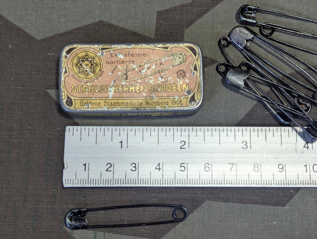 Original German Stahlsicherheitsnadeln tin of steel safety pins. There are 10 pins inside. The tin is a bit worn and some pins have some discoloration.