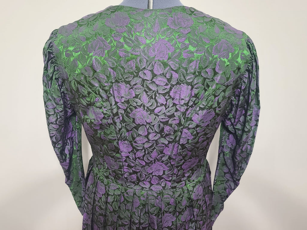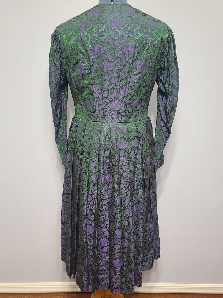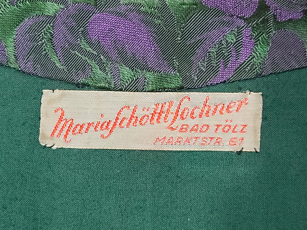 Maria Schöttl-Lochner Bad Tölz Marktstr, 61 label. The dress is a heavier weight winter material. The green has a nice iridescent shine to it. The front closes with hooks and eyes - the rotate each side so it stays fastened more securely. The front where the hooks and eyes are has boning like a corset. Snaps below the hooks and eyes and at the end of the sleeves. One side pocket. Overall very good condition. There are sweat shields sewn in - the sweat shields have some light staining, but the dress does not.