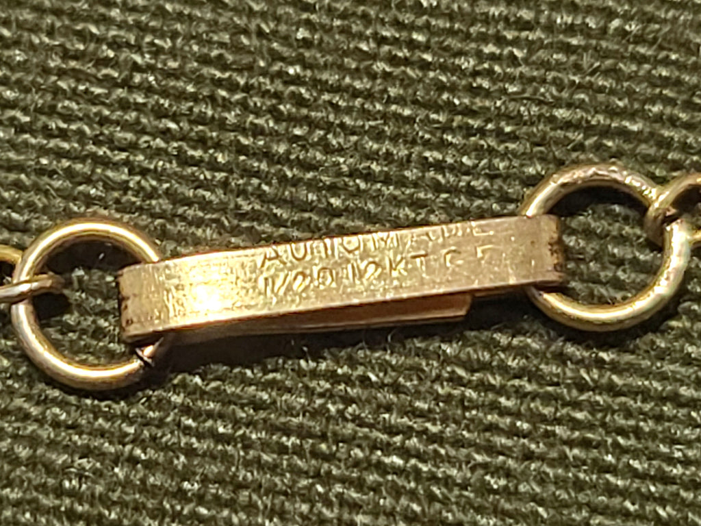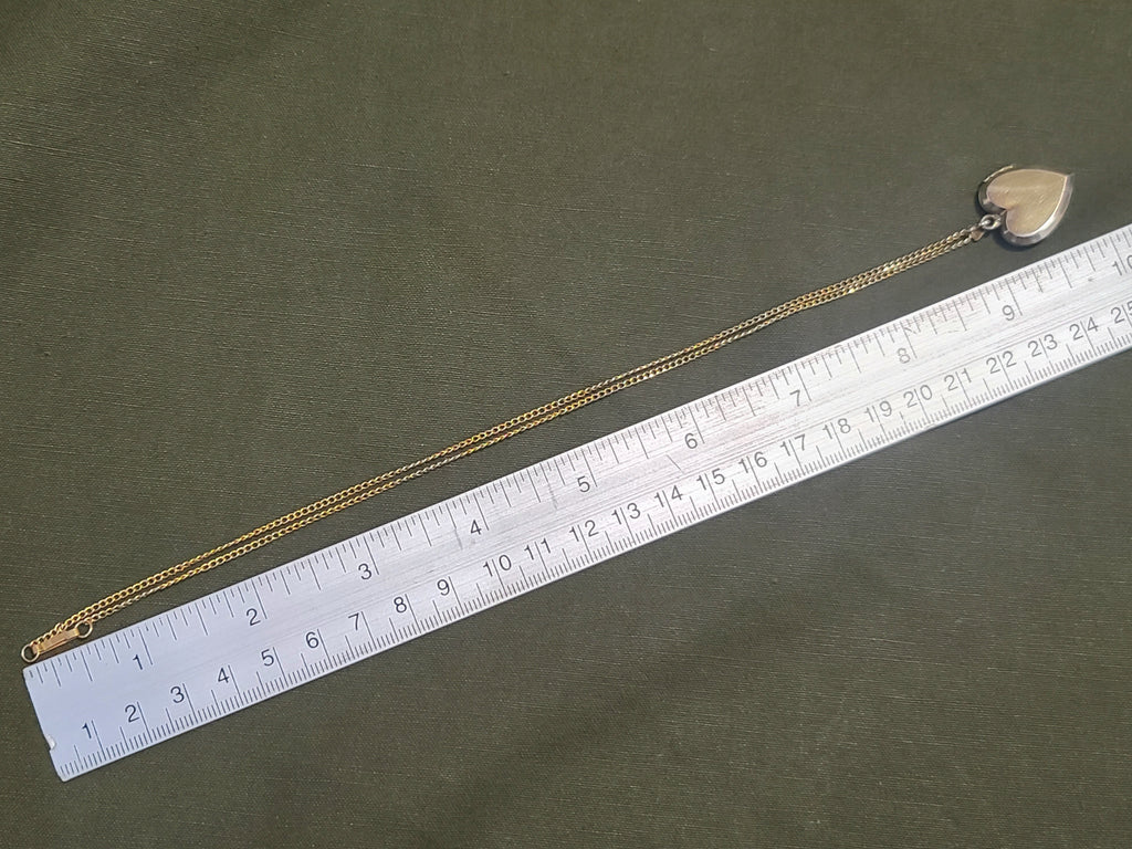 Vintage WWII sweetheart Marines locket necklace. Nice heart shaped locket with the USMC EGA. Nice mother of pearl piece. Overall fairly good condition. There is some discoloration on both the locket and the chain. The inside and the clasp are marked "1/20 10 KT. - G.F." The clasp also looks like it has a brand name on it. The inside heart pieces meant to keep the photo is place are a little loose. The clasp stays closed, but is a little finicky. You have to make sure it is closed tightly or it will pop open.