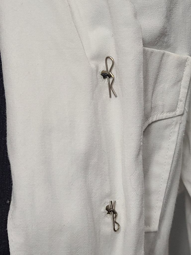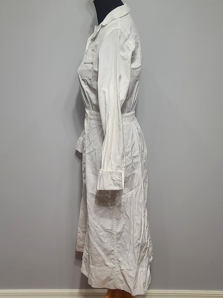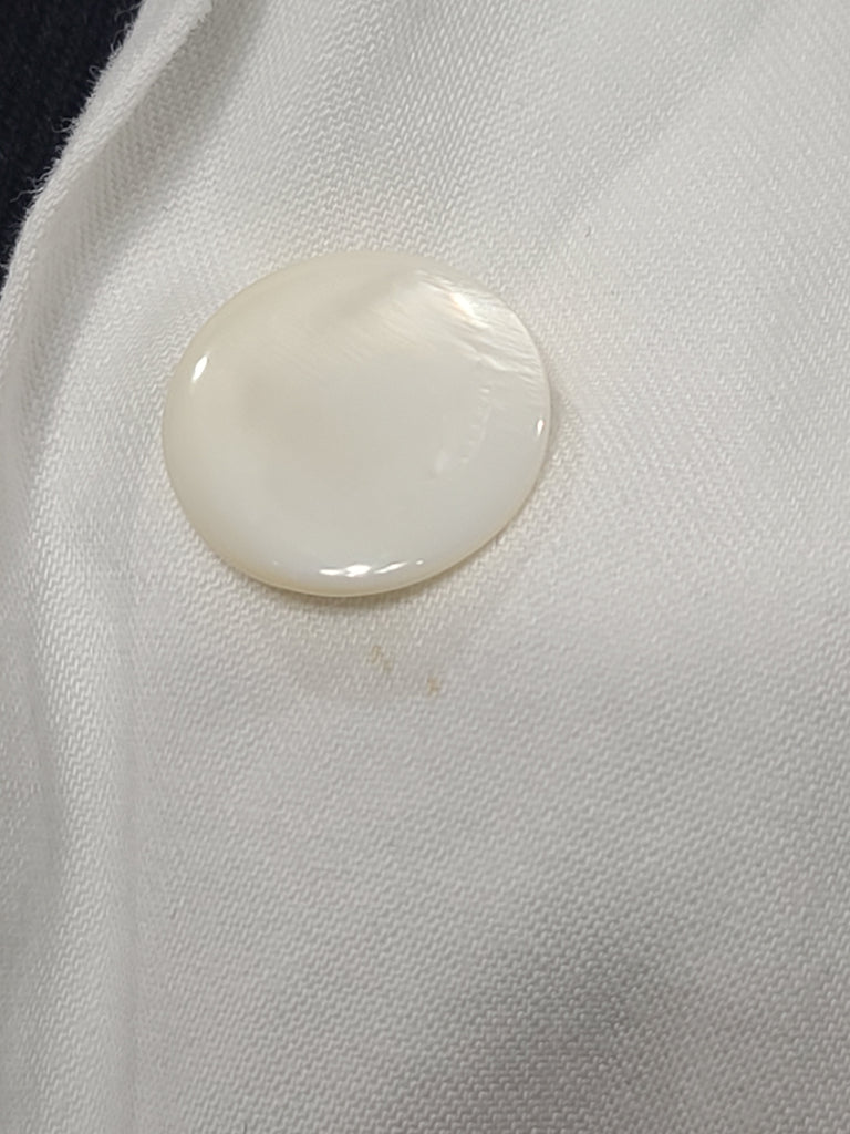 Made of cotton poplin and closed by detachable white pearl buttons with cotter pins. It is missing the belt (it does have a large 4" hem so that material could be used to make a belt). It does not come with cufflinks. Naval Clothing Depot label that is generally thought of as very late war and was used postwar as well. Size 16R.