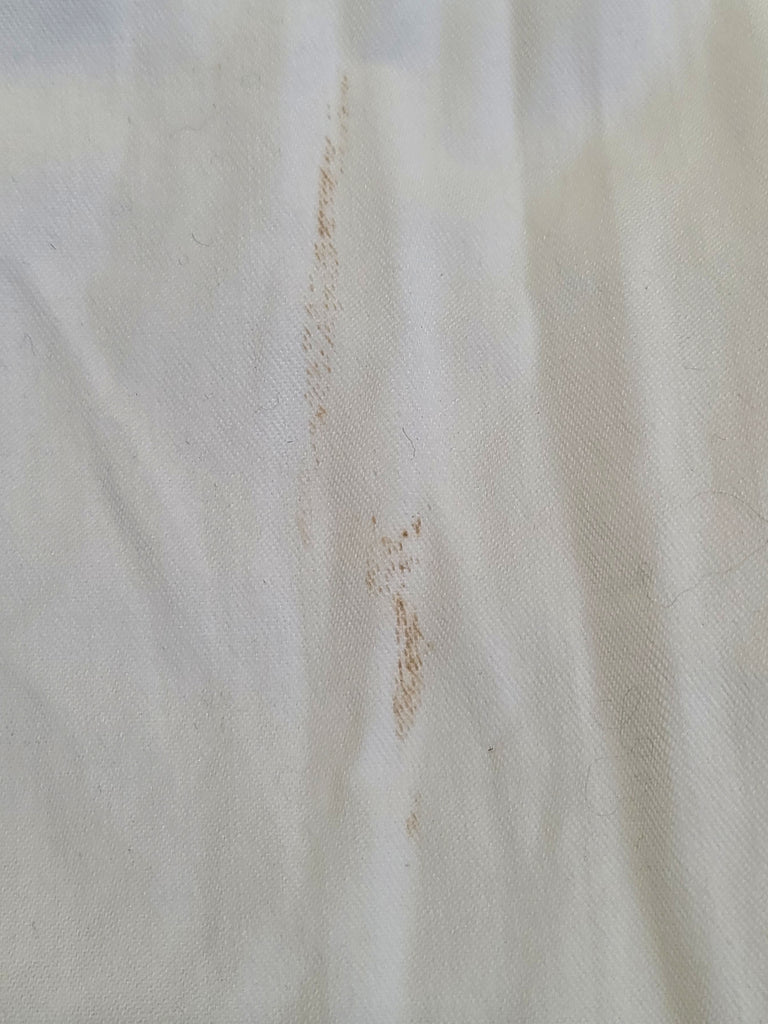 CONDITION: Good, wearable. There are some yellow stains near the pocket and along the waist. One small hole above the hip pocket. Some brown staining toward the bottom of the skirt. Small black spots on the collar. A couple tiny brown specks near the buttons (not visible when worn).