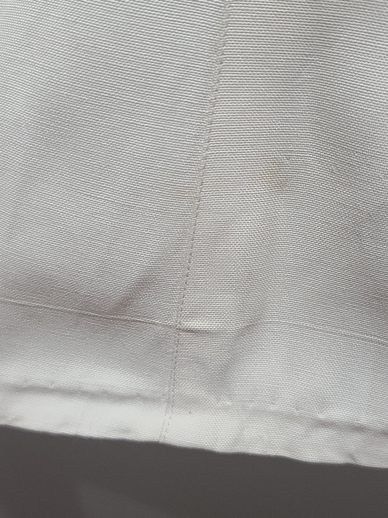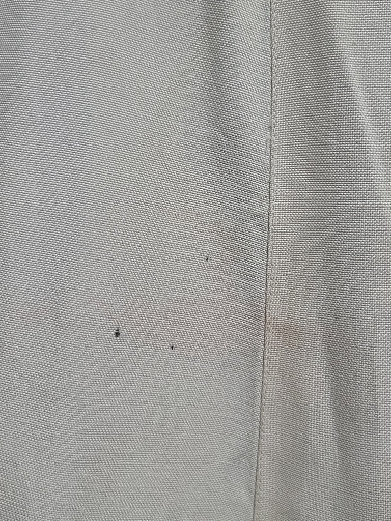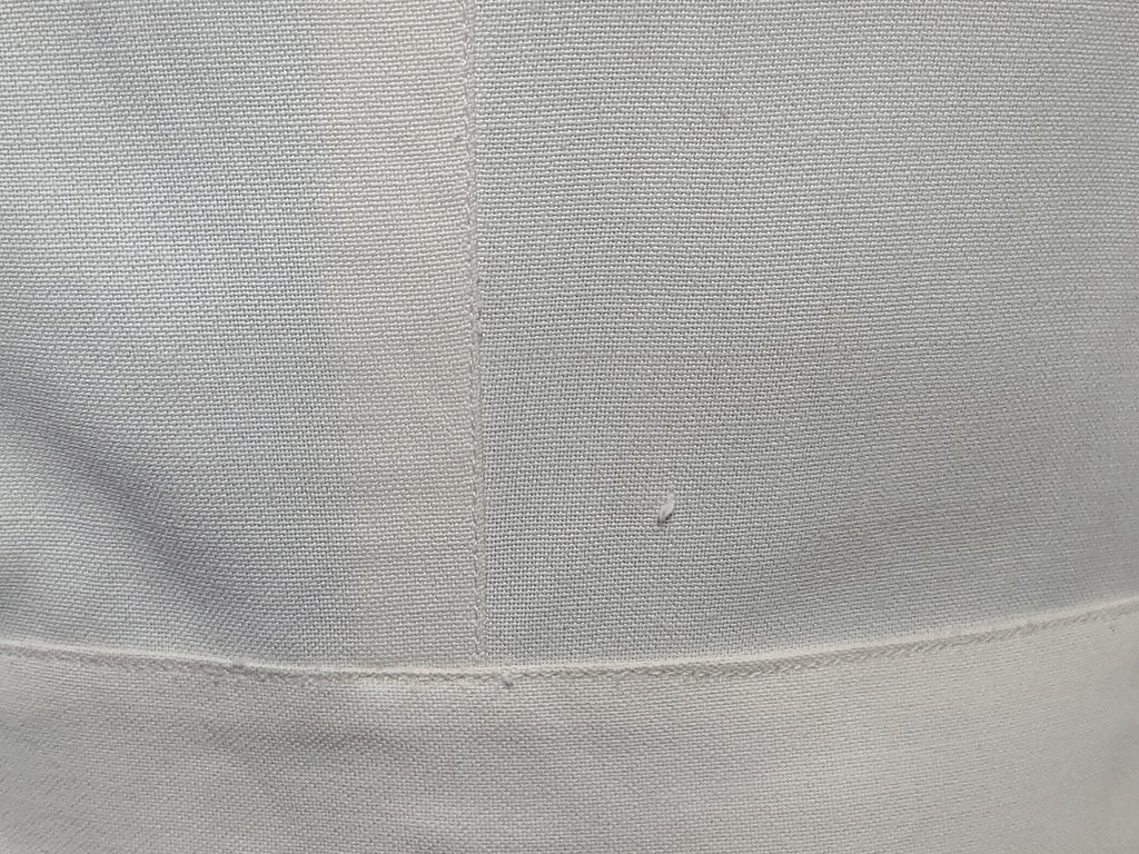 Overall fairly good condition with some issues. The jacket and the skirt are slightly different shades. There is some light overall discoloration / yellowing, but its not too detracting (I have not attempted to clean it). Very light staining along the collar and lapels. A few pulls in the material. One of the bottom front pockets lays a bit odd. Small brown speck on one shoulder. Pinkish smudge on the inside of one sleeve. Odd square patch on the inside (not visible when worn). Buttons are held in place by cotter pins (some staining on the inside hidden flap).  Sewn in shoulder pads that have come unstitched and need resewn. The skirt has been taken down and you can see where the original hem length was. The skirt has some black spots and a few tiny holes and some pinkish discoloration near the spots/holes. Side metal zipper and buttons (the buttons look like they have been moved a few times).
