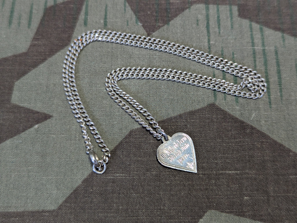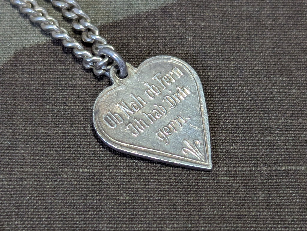 Vintage German "Ob Nah ob Fern Ich hab Dich gern" (whether near or far, I love you) heart necklace. Cute rhyming poem. The charm is marked 900 silver on the back. Good condition with light wear.