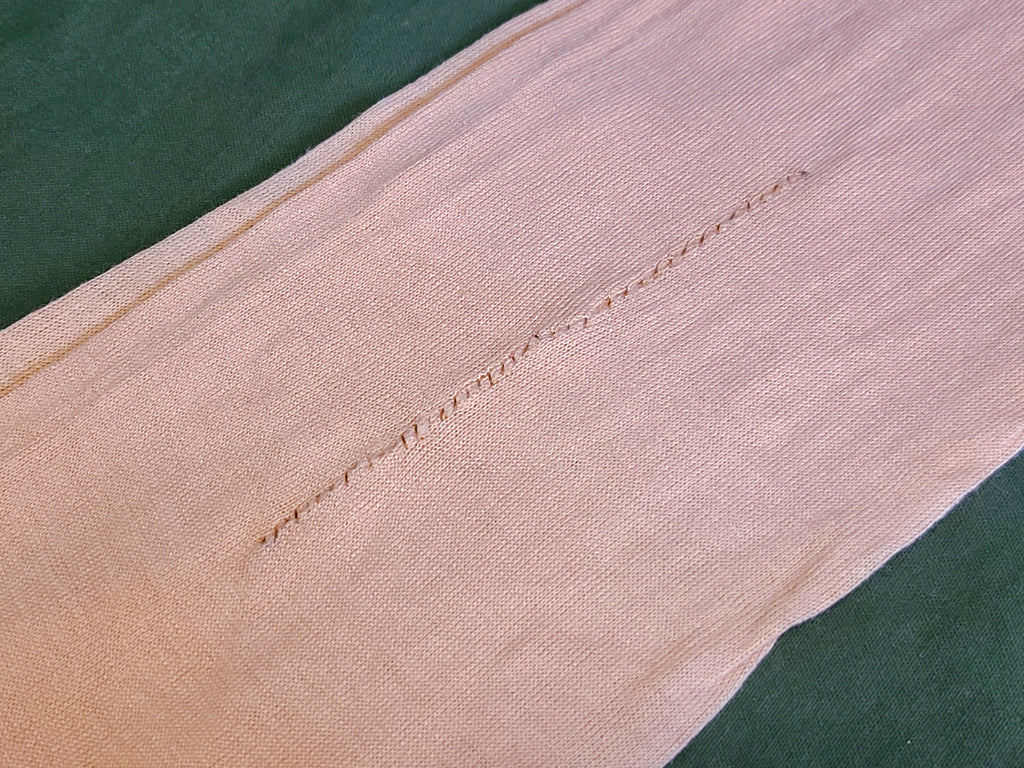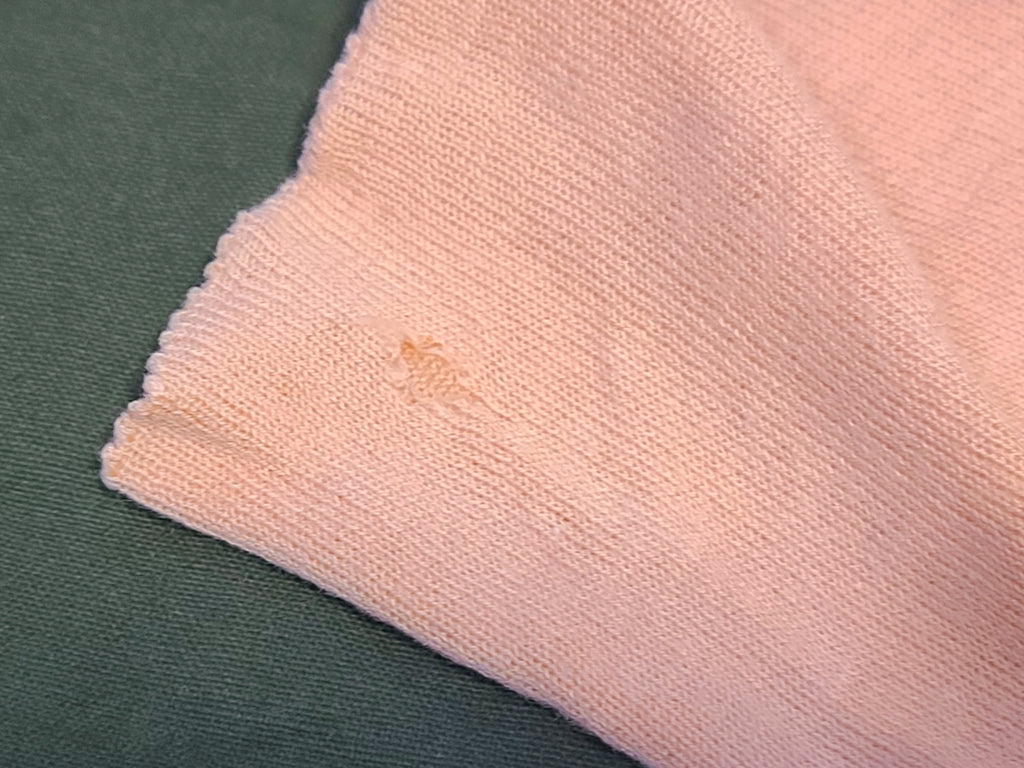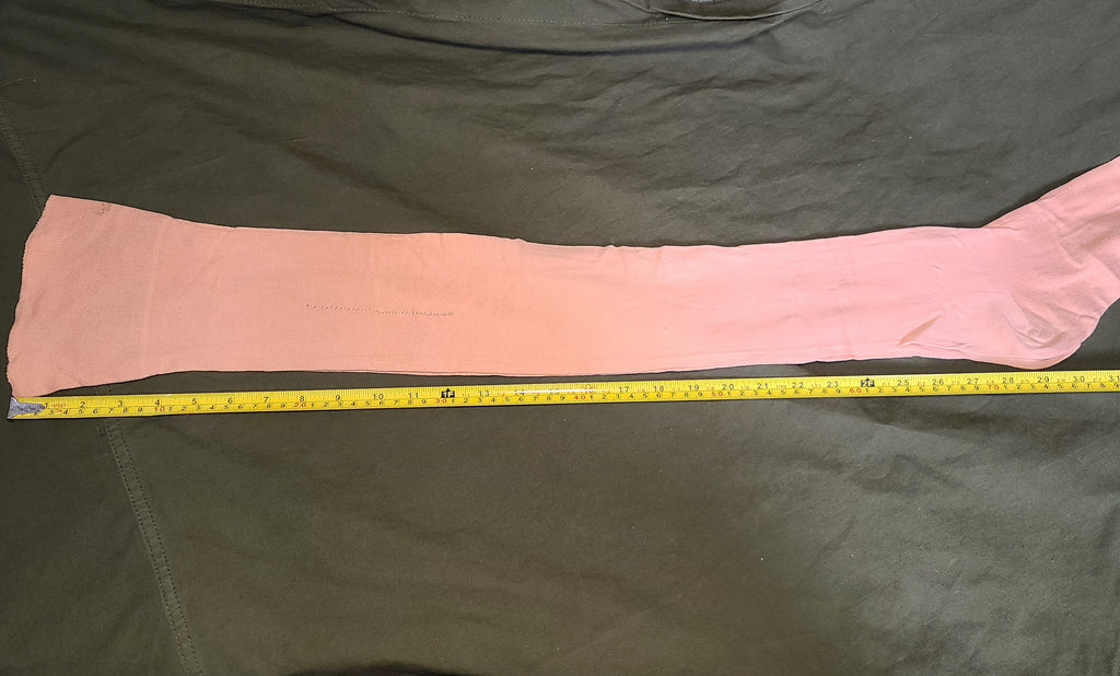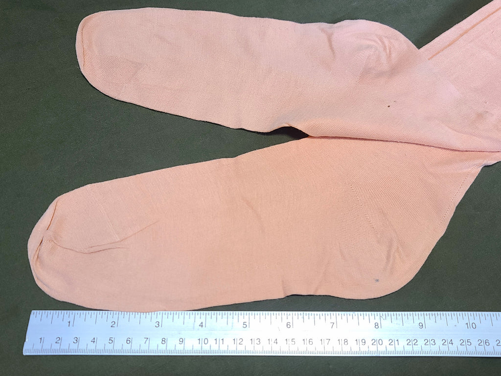 Vintage 1940s pink seamed stockings. They are approximately a size 8 1/2 or 9. The color is a pink, not a skin color; it's like the light pink often seen on lingerie. There are some repairs, light stains and a small hole at the top.