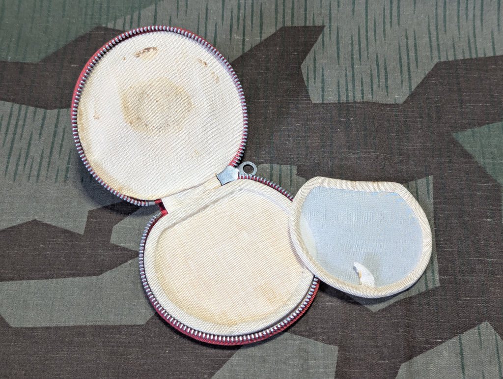 Vintage 1930s / 1940s red leather zip up makeup compact. The zipper is marked Komet D.R.P. (Deustches Reichspatent). This seems like a very odd and messy way to do a powder compact. There is some staining on the inside where I think there used to be a mirror glued. Interesting piece with no powder inside.