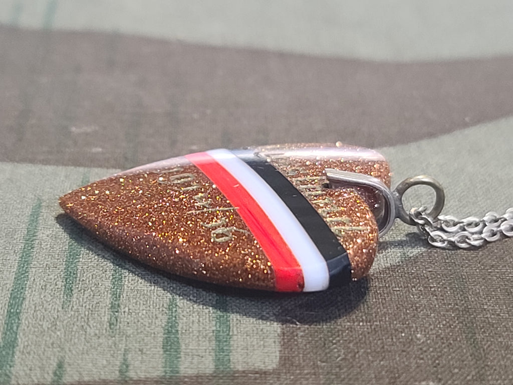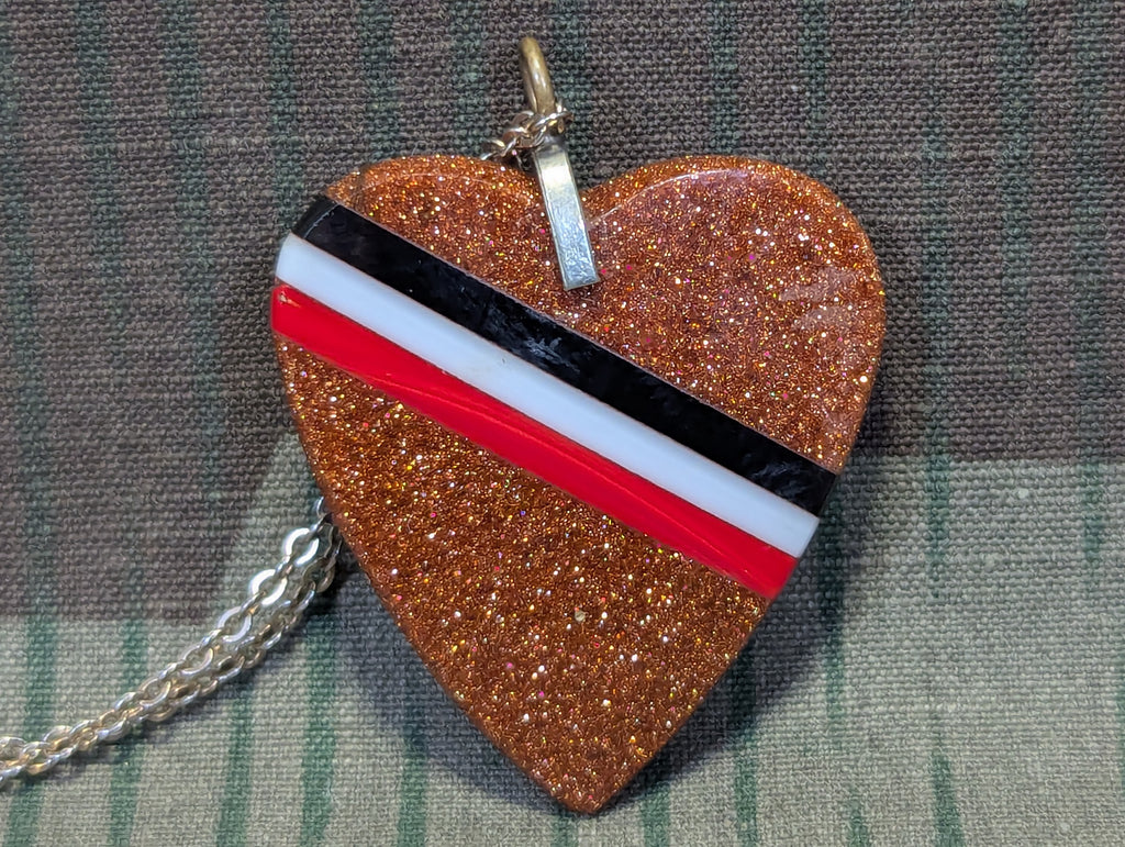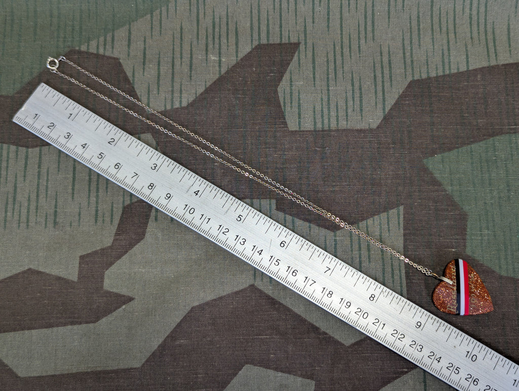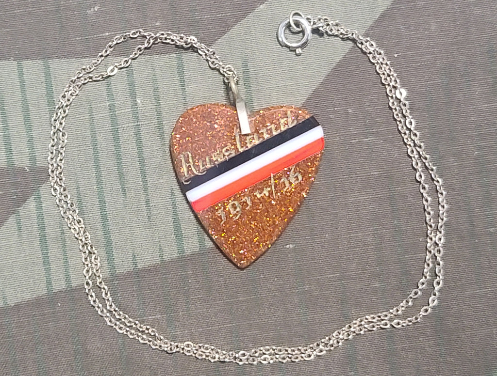Original WWI German sweetheart style necklace engraved Russland 1914-16. It is in good condition. This is made from a material called goldstone. It looks out of place, but it is actually from the era. Nice imperial colors through the middle of the heart.