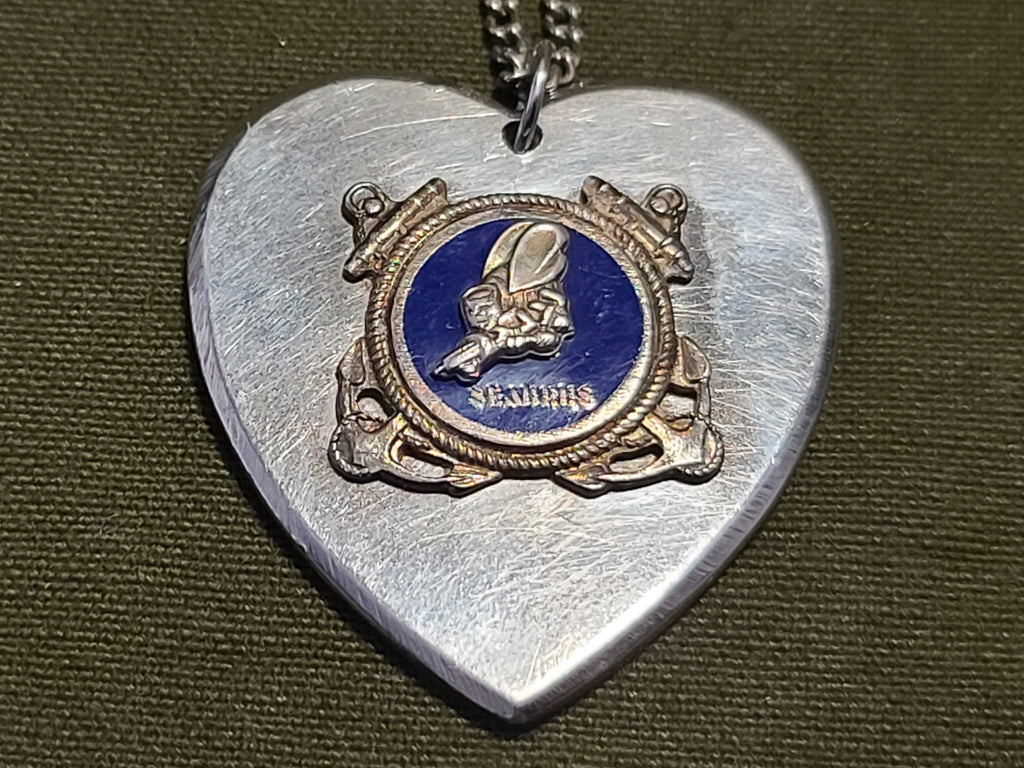 Vintage WWII Seabees heart shaped sweetheart necklace. Fairly good condition. Some scratches on the back of the charm. No markings.