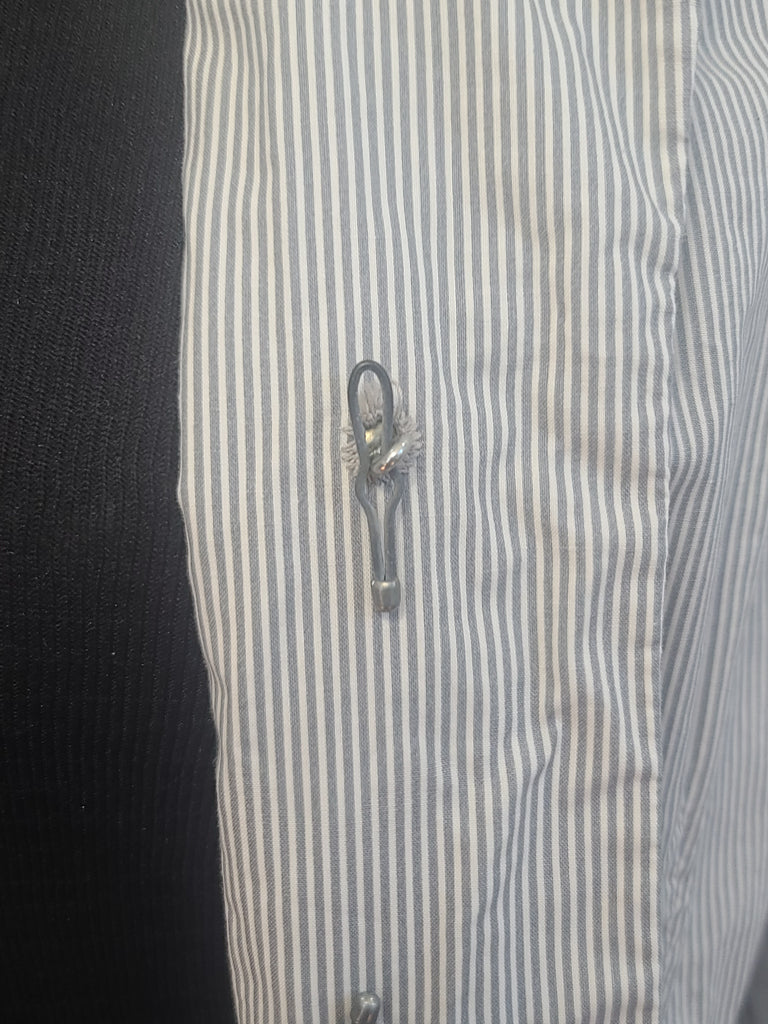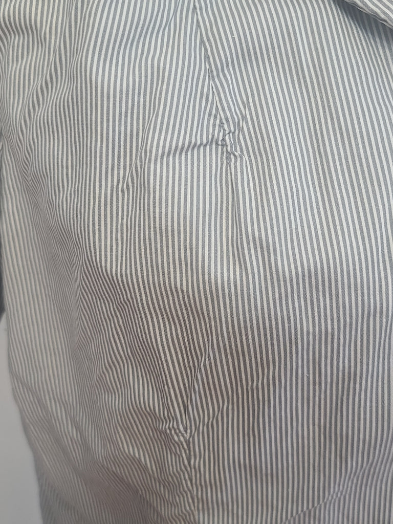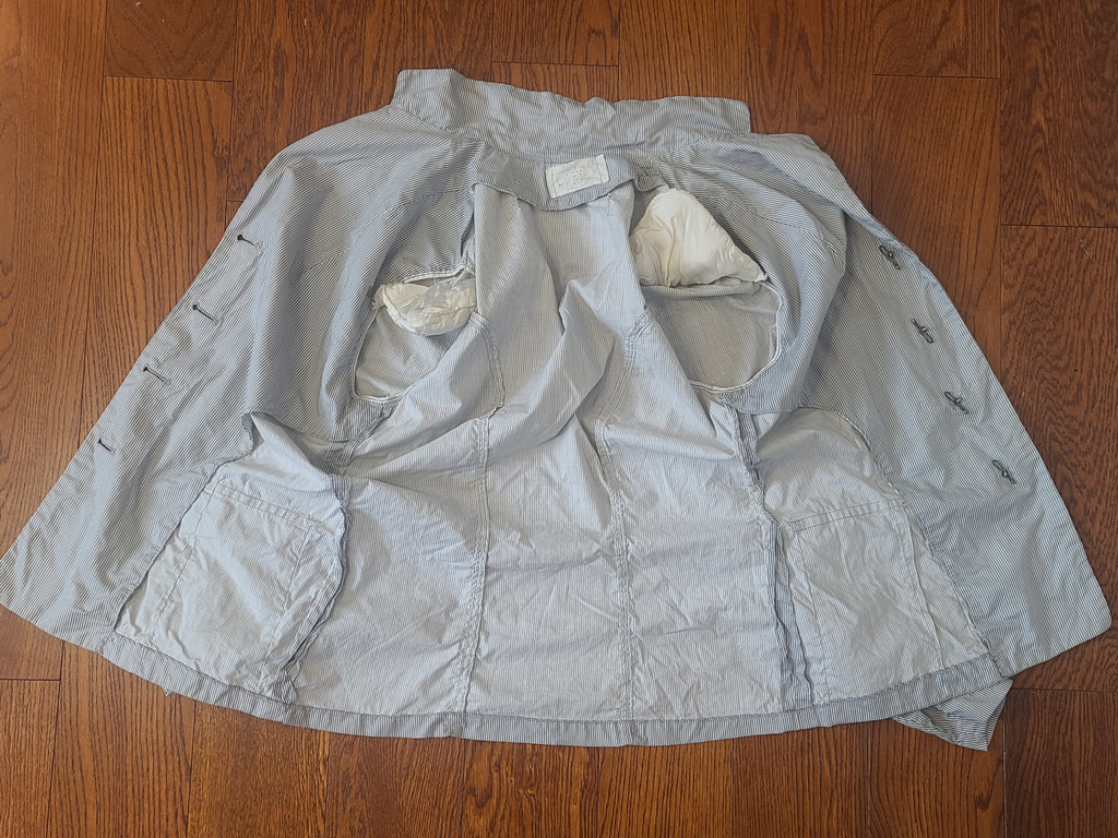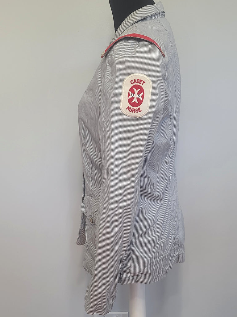 Striped summer weight tunic. Cadet Nurse patch on one sleeve. Overall very good condition. The buttons show light wear and minor discoloration. The size tag is completely washed out. The main buttons are held on by cotter pins, and the epaulet and pocket buttons by s-hooks. Sewn-in shoulder pads that need re-stitched a bit. Some odd stitching on the chest darts.