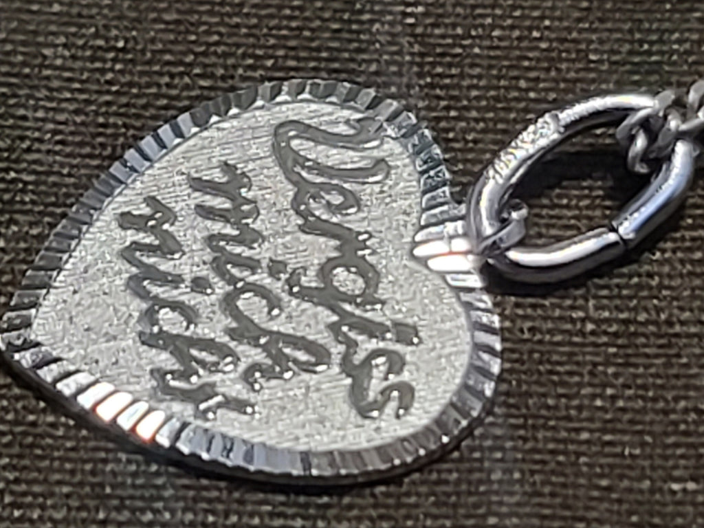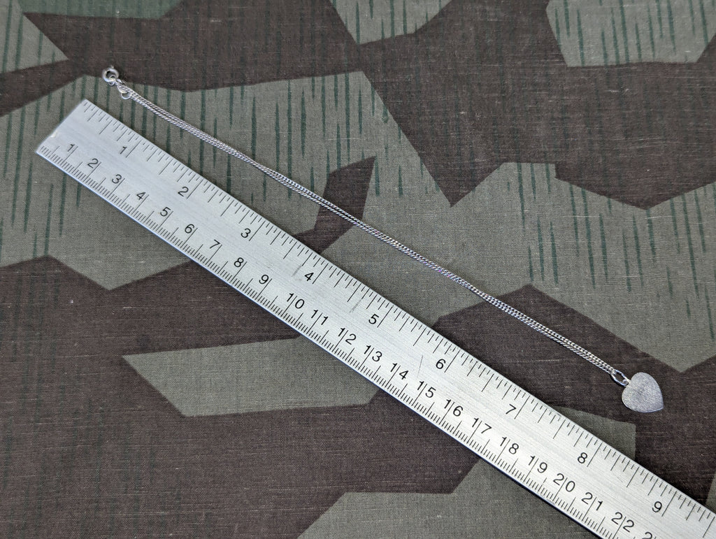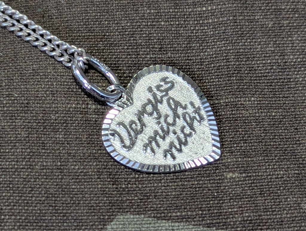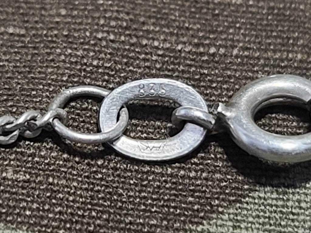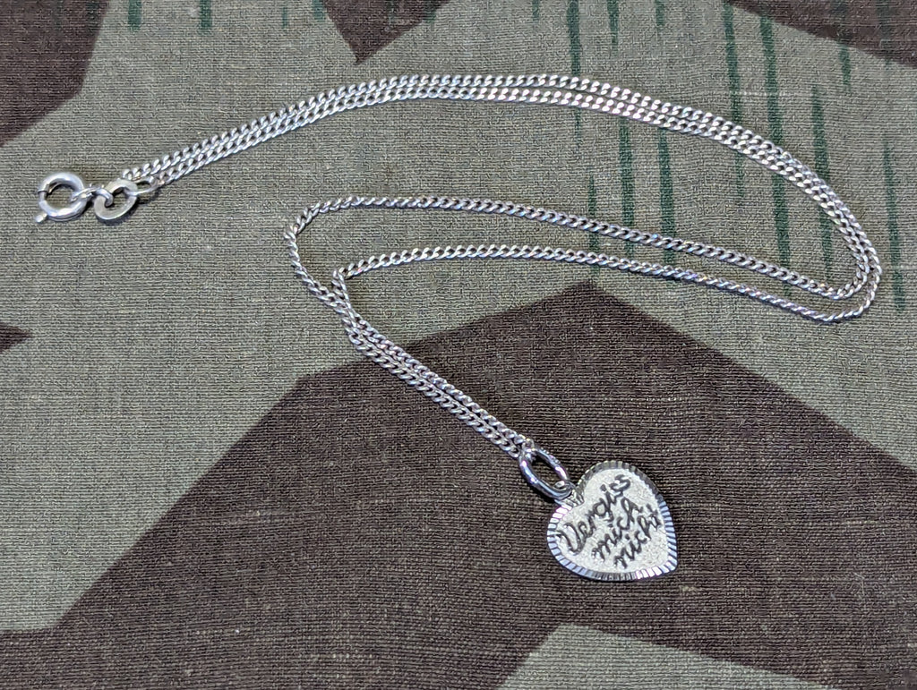 Vintage Vergiss Mich Nicht (Forget me not) small heart charm necklace. The link near the clasp is marked 835 and a maker mark (looks like HK?). The jump ring on the heart is marked as well, but it is hard to make out. The top loop on the heart charm is a little bent.