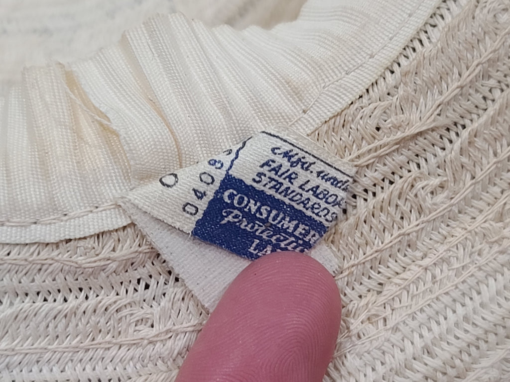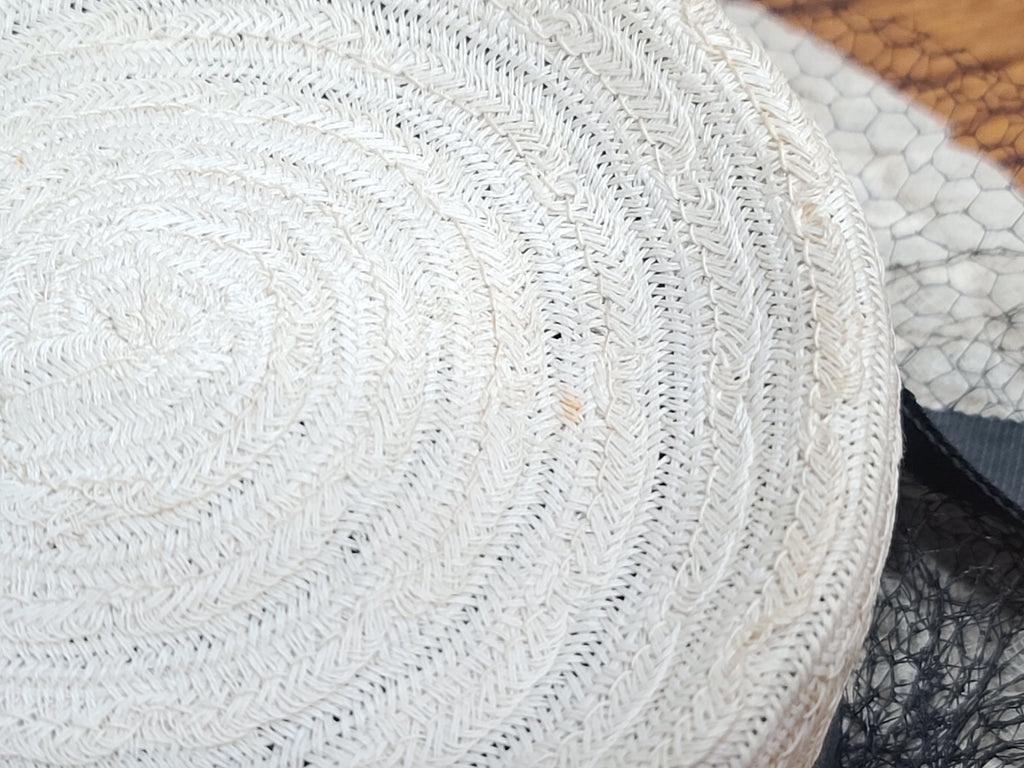 Vintage 1940s white / off-white straw(?) tilt hat. Styled like a boater hat. New York Creation Consumer Protection Label. This style hat is meant to be worn at an angle, it is not meant to sit on top of your head. Tilt hats became popular due to material rationing. Black band and black netting. There are a few holes in the netting. Some overall light discoloration.