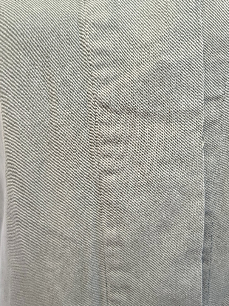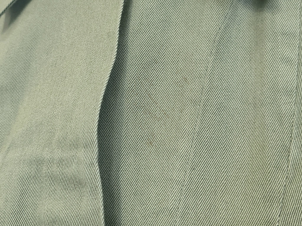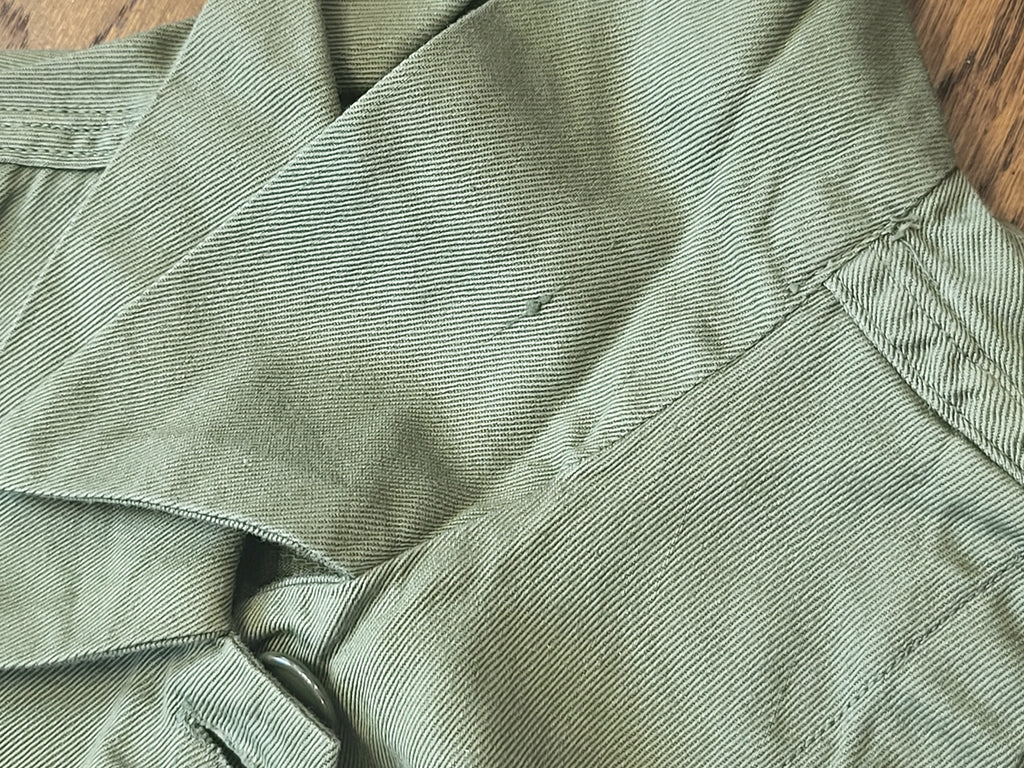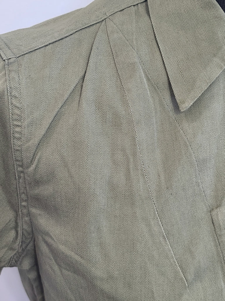 Name written in the neck. Good condition wearable as is, but it does have some light staining. Worst staining is on the sleeves and a bit by the buttons. Some pulls in the material.
