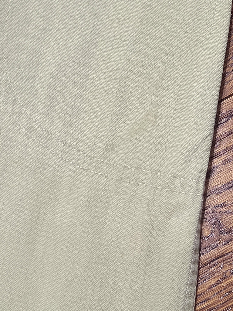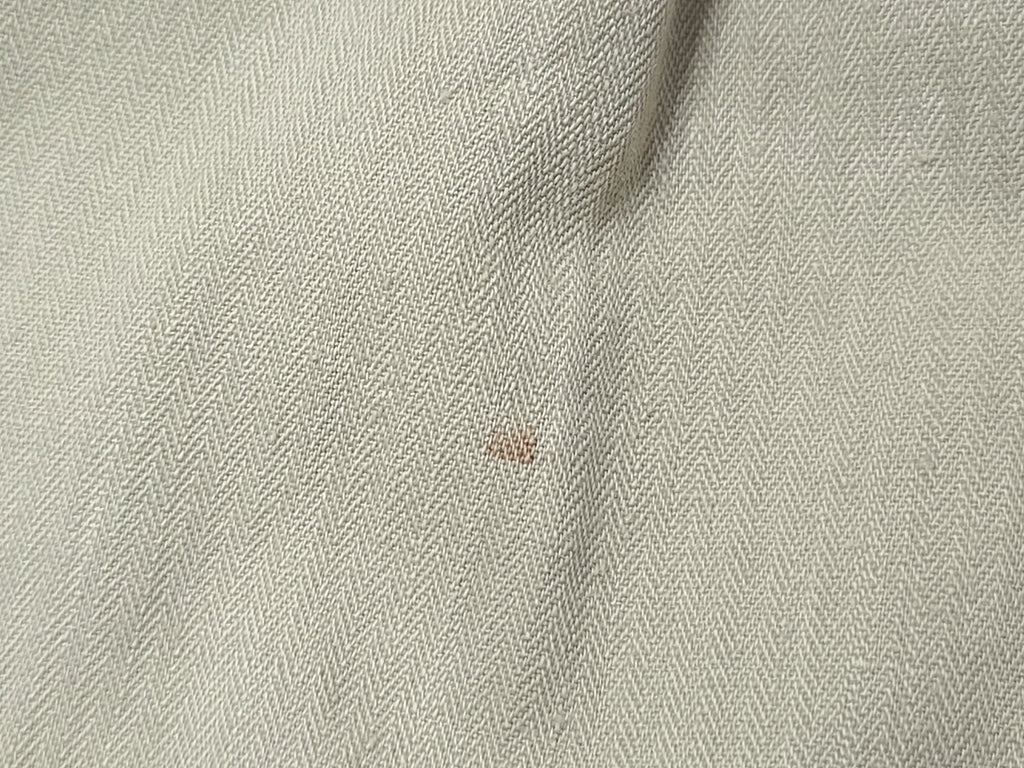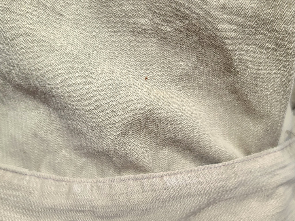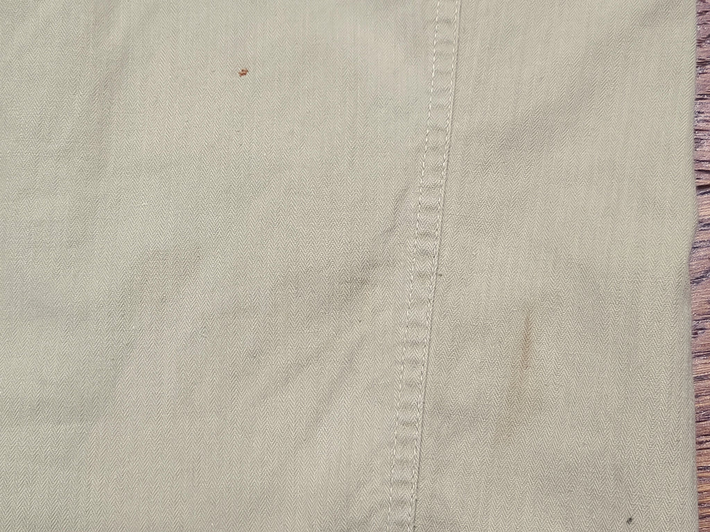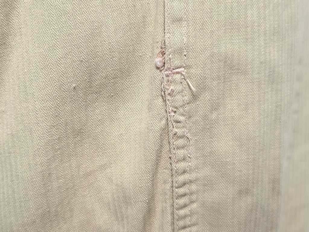 Stamped in several places "R-7181". It looks like there was a patch of some sort above the pocket. There are some rust colored specks and some black smudges. Light brown staining in places (mainly on the legs).  A few tiny pinprick holes in the back by the collar. A couple small holes - the biggest is on the side near the waist. The darts on the back of the "shirt" have been taken out (you can see the stitch marks where they were originally sewn). Some loose strings. The bottom of one pantleg has a nick and some fraying. I tried to show all the stains and holes in the pictures. Overall it is still in pretty good condition and wearable.