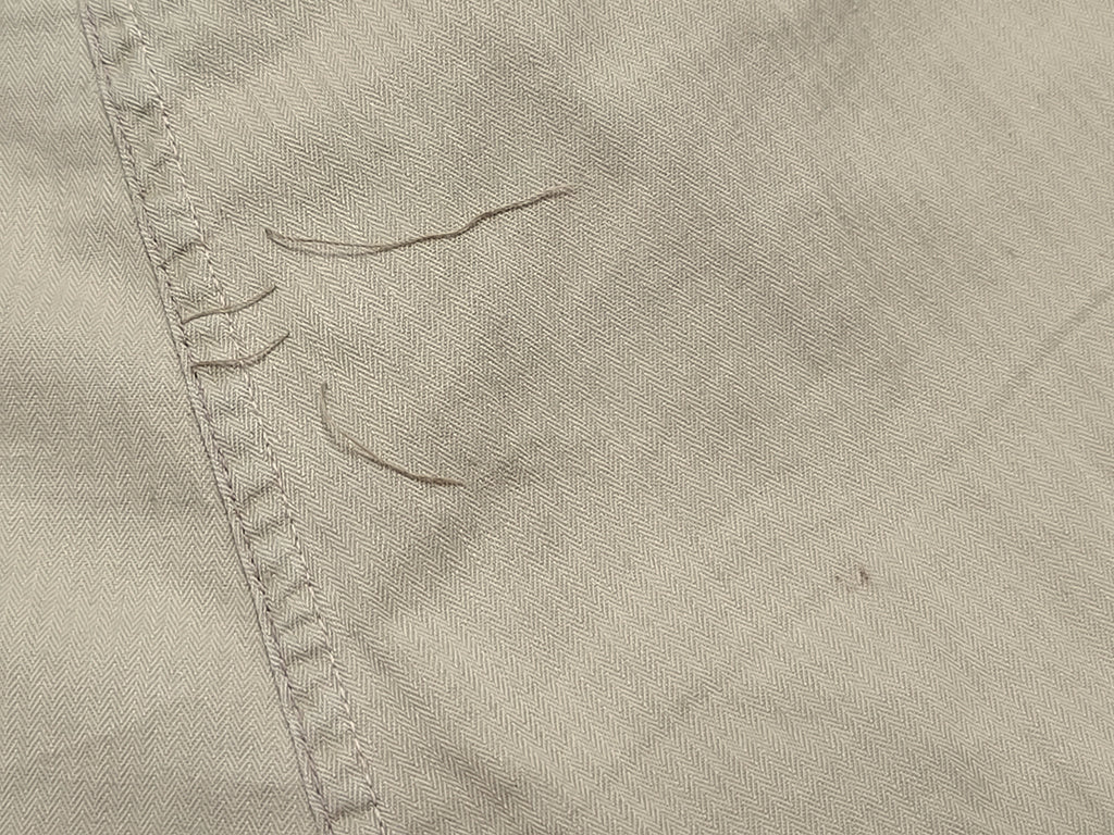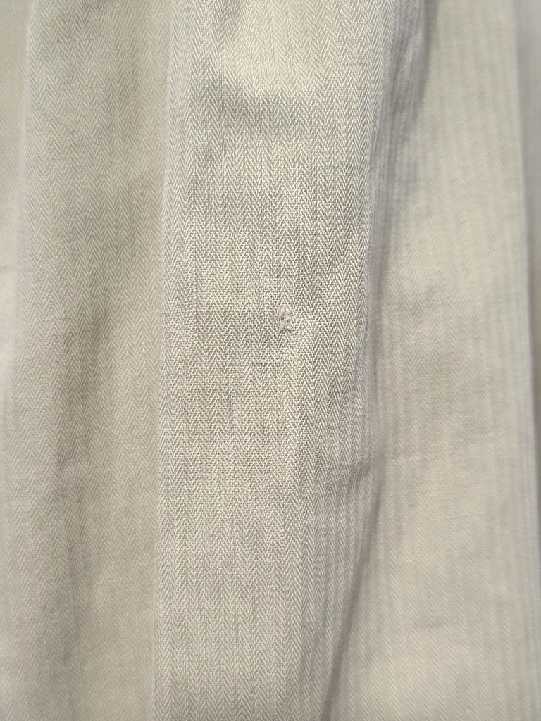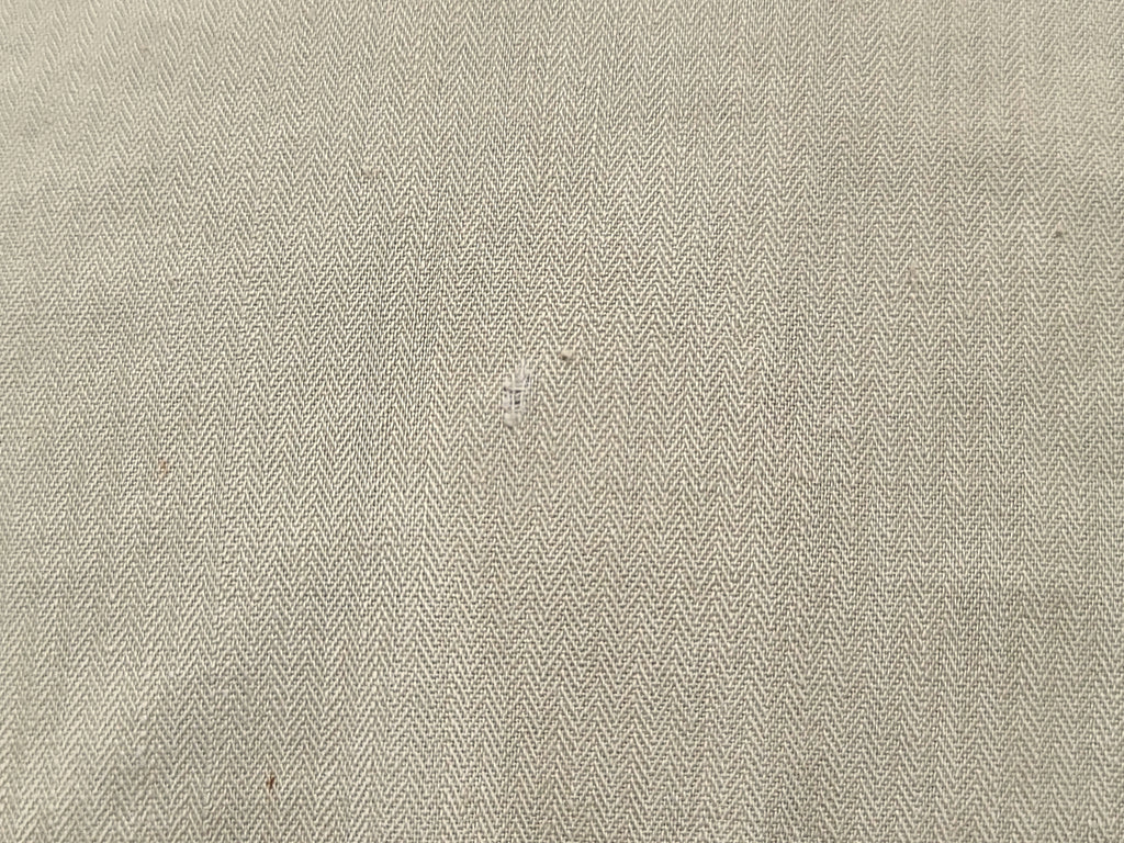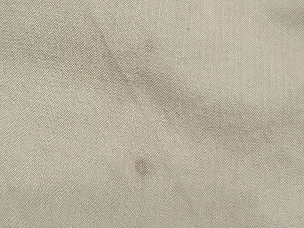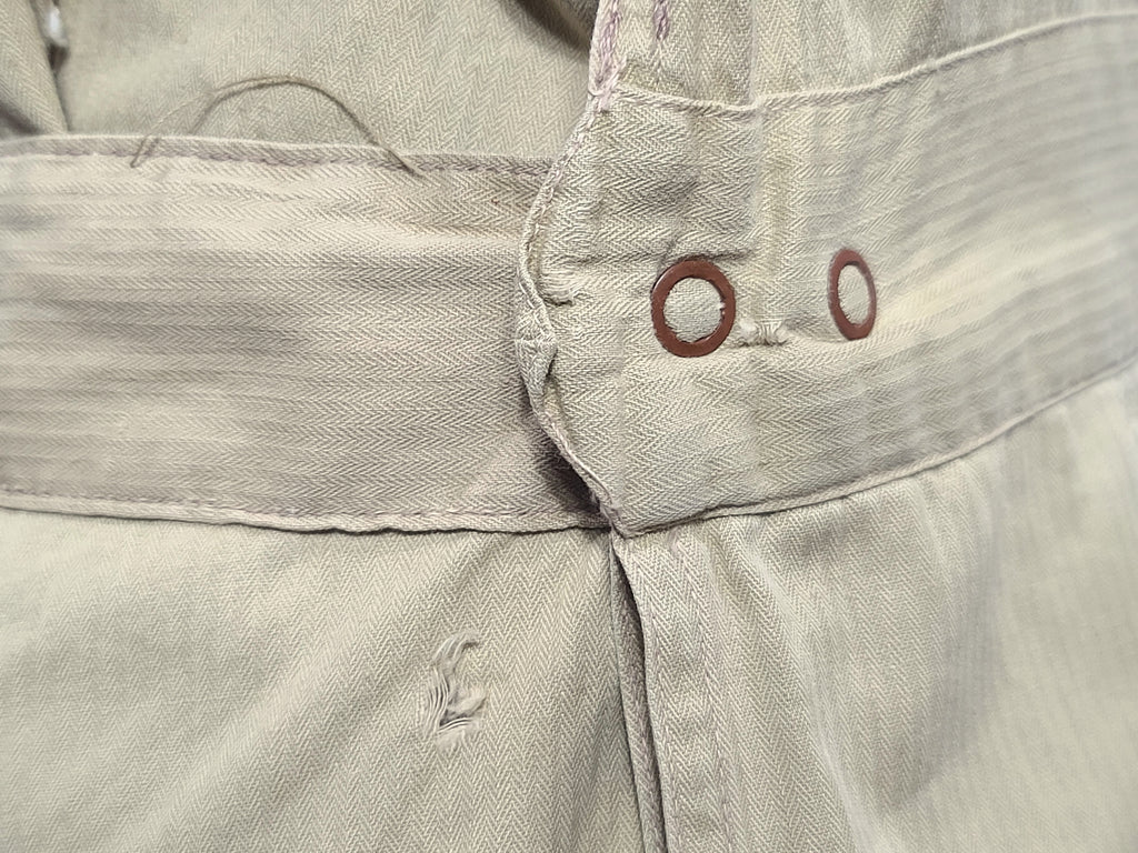 Stamped in several places "R-7181". It looks like there was a patch of some sort above the pocket. There are some rust colored specks and some black smudges. Light brown staining in places (mainly on the legs).  A few tiny pinprick holes in the back by the collar. A couple small holes - the biggest is on the side near the waist. The darts on the back of the "shirt" have been taken out (you can see the stitch marks where they were originally sewn). Some loose strings. The bottom of one pantleg has a nick and some fraying. I tried to show all the stains and holes in the pictures. Overall it is still in pretty good condition and wearable.