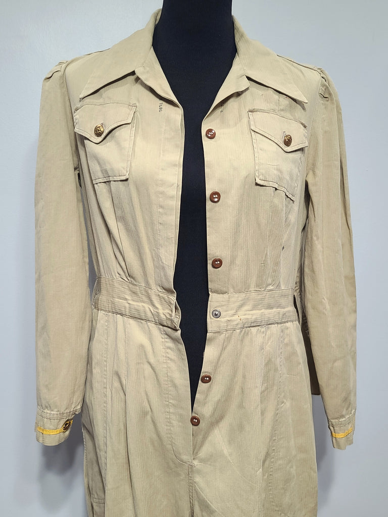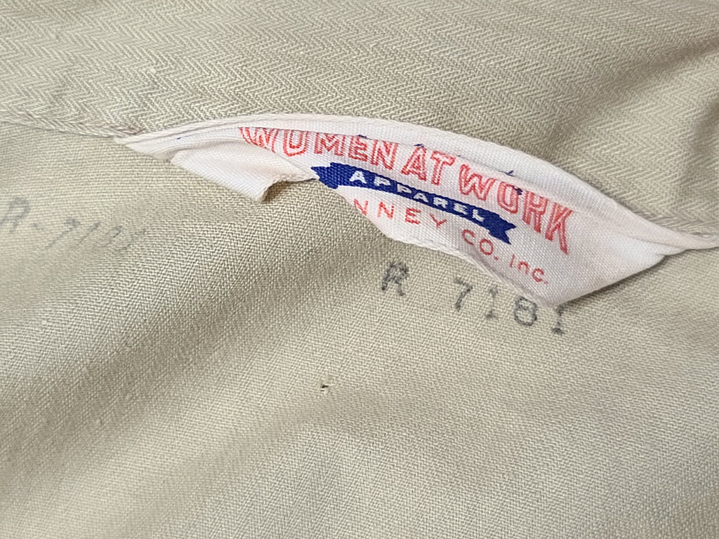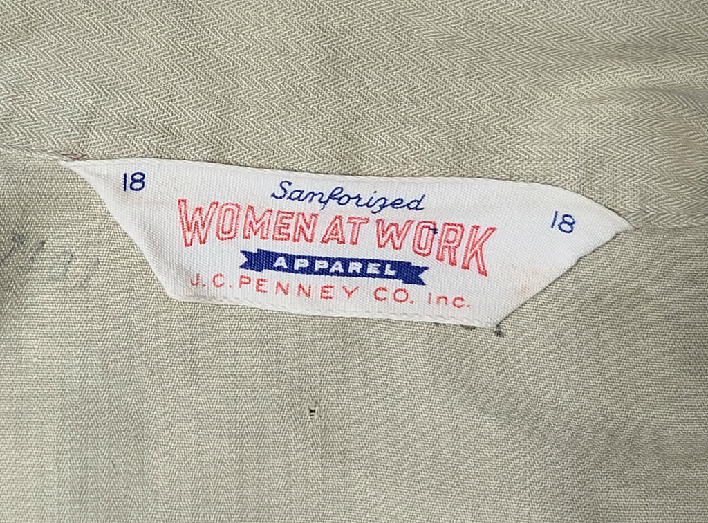 Nice workwear overalls. Nice label: Women at Work Apparel J. C. Penney Co, Marked size 18. Khaki color with gold colored miniature navy buttons. Hidden buttons down the front and snaps at the waist and down the side. The snaps at the side of the waist can be adjusted for size. The top just tucks into the bottom. It is made this way to make it easier to use the restroom (you just pull the top out and unsnap the sides instead of taking the whole thing off).