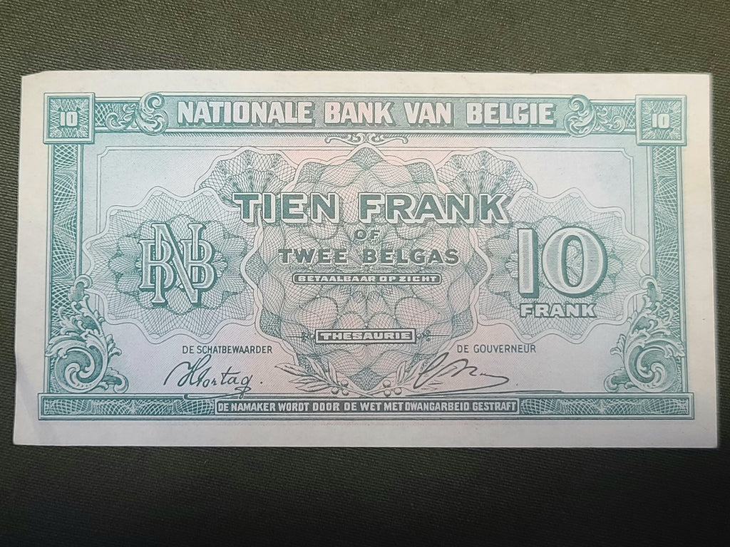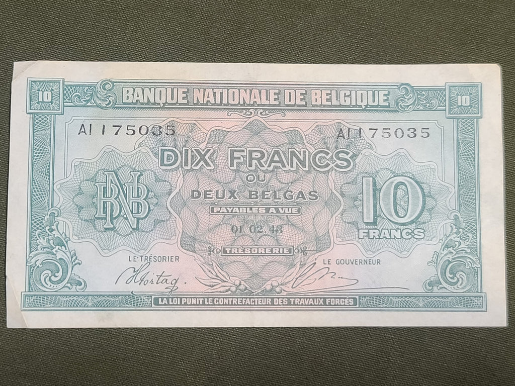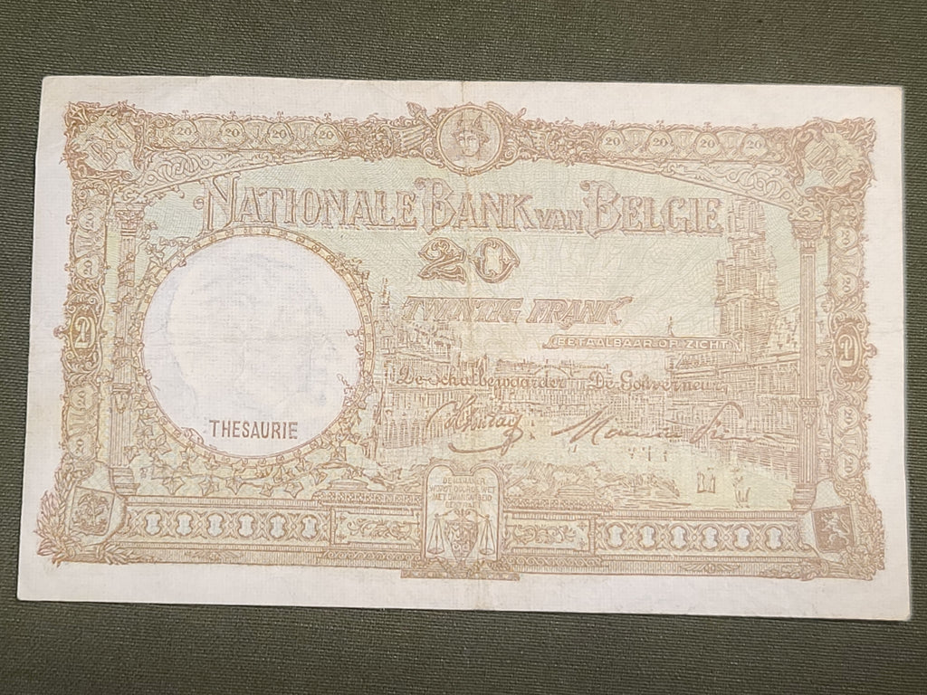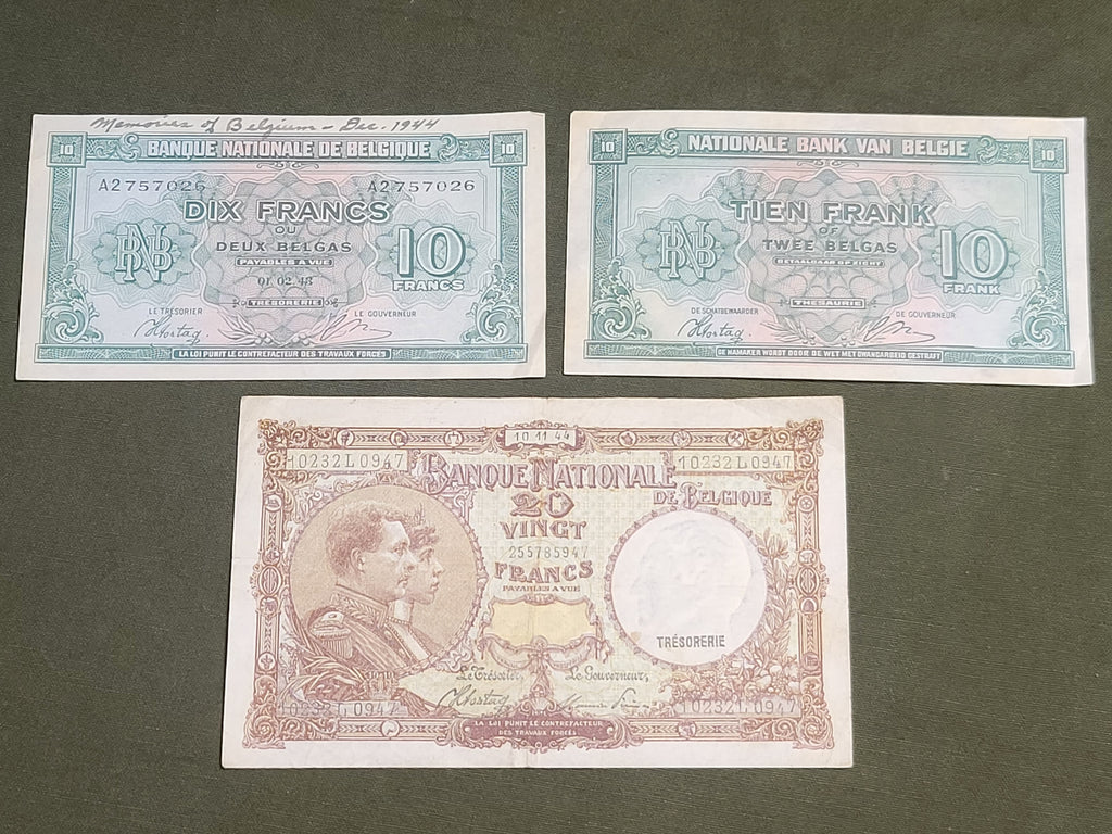 Lot of three original Belgian notes two 10 Franc notes and one 20 Franc note. The notes are dated 1943-1944. There is a small note on one that reads "Memories of Belgium - Dec 1944".