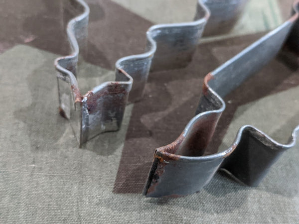 Complete original 1930s / 1940s cookie cutter set. The box is marked DRGM. Some of the forms have broken solder joints. One has a bit of denting and some have a little rust. It does still have the special little cutter tool which is often missing (it does have a few rust specks). The paper label has some peeling on it (see photos).