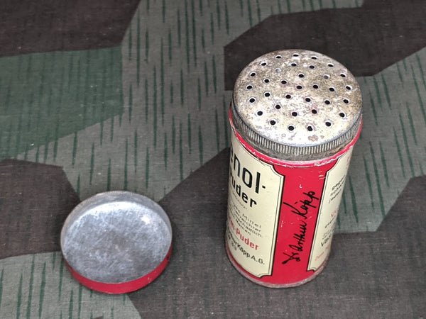 Original pre-war or wartime era Vasenol foot powder container. It is in good condition. It is basically empty but there is still some powder inside. An ad for this in the August 1940 issue of Die Wehrmacht magazine. Powders like this were popular and widely used within the Wehrmacht. These are fairly rare as they were often used up after the war. This is another one of the widely recognized brand names within the collecting and reenacting communities. A very nice display item.