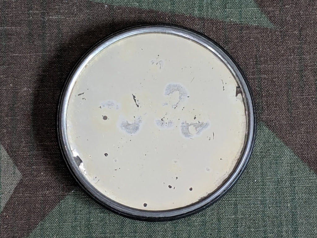 It is in good condition with some wear. There is a slight indent on the front. The mirror has some age related spots. It measures about 2 1/4" in diameter.