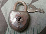 This is a period correct German lock. It is a little rusty, but it works. It comes with one key. It is about 2 1/2" tall. The wire diameter is about 1/4" and the space inside is approximately 5/8" wide and 3/4" high.
