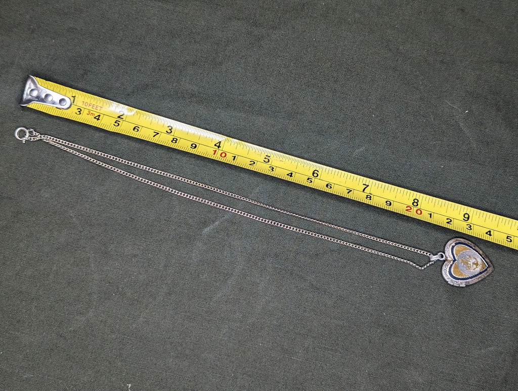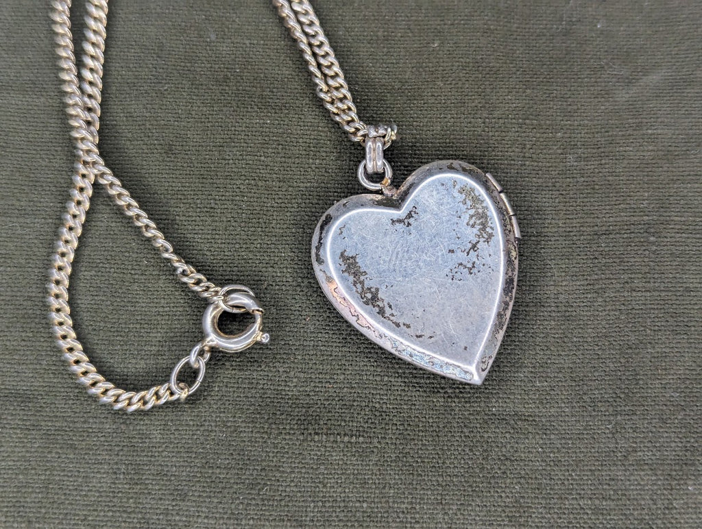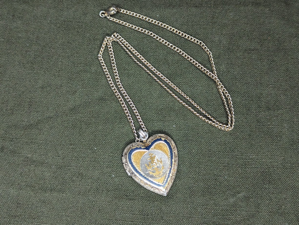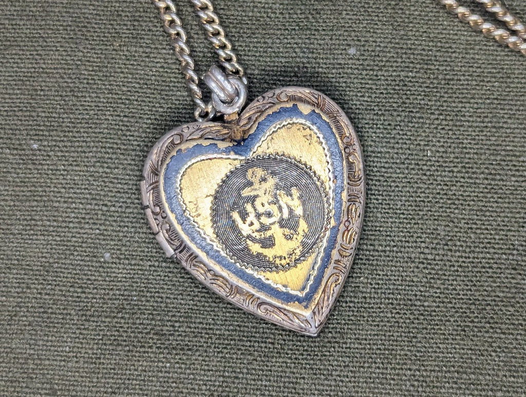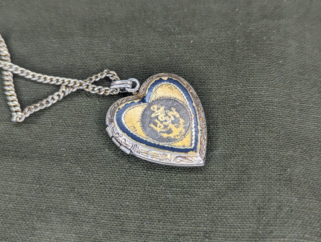 Vintage WWII Navy sweetheart necklace with etched USN and anchor on the heart-shaped locket. The inside is marked Sterling. There is overall wear and discoloration on both the locket and the chain. Some chips on the paint in the design.