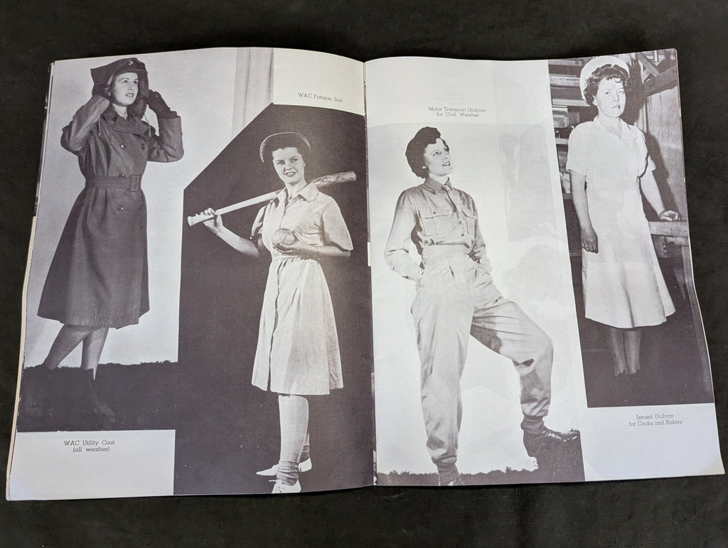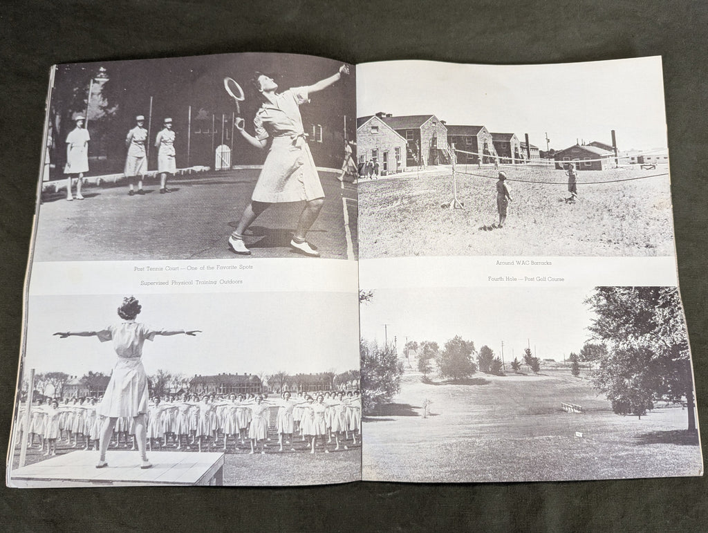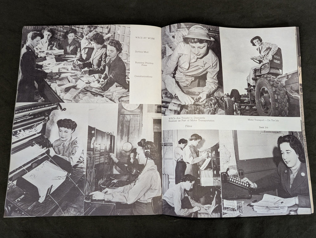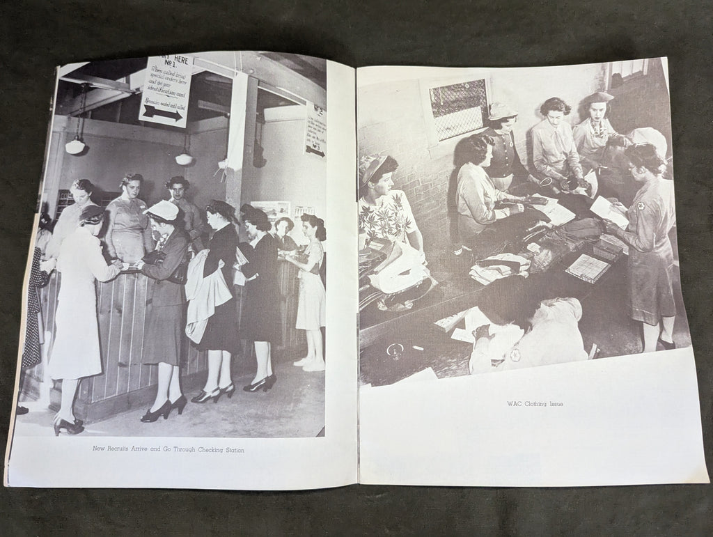Original WWII WACs at Fort Des Moines Iowa booklet. There is no date, but its likely late 1943 or 1944. Lots of photos of uniforms, lodging, WACs performing various duties, sports and even the inclusion of black WACs. Overall good condition with light wear.