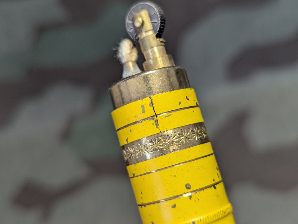 Nice, rather large German bullet or artillery shell shaped lighter in good condition except for a small crack at the top of the yellow segment. The base has a small separate fuel tank, which I believe was supposed to hold extra flints. A very unusual feature. I do not know if the small crack will effect the function or if it will need a repair to prevent leaking.
