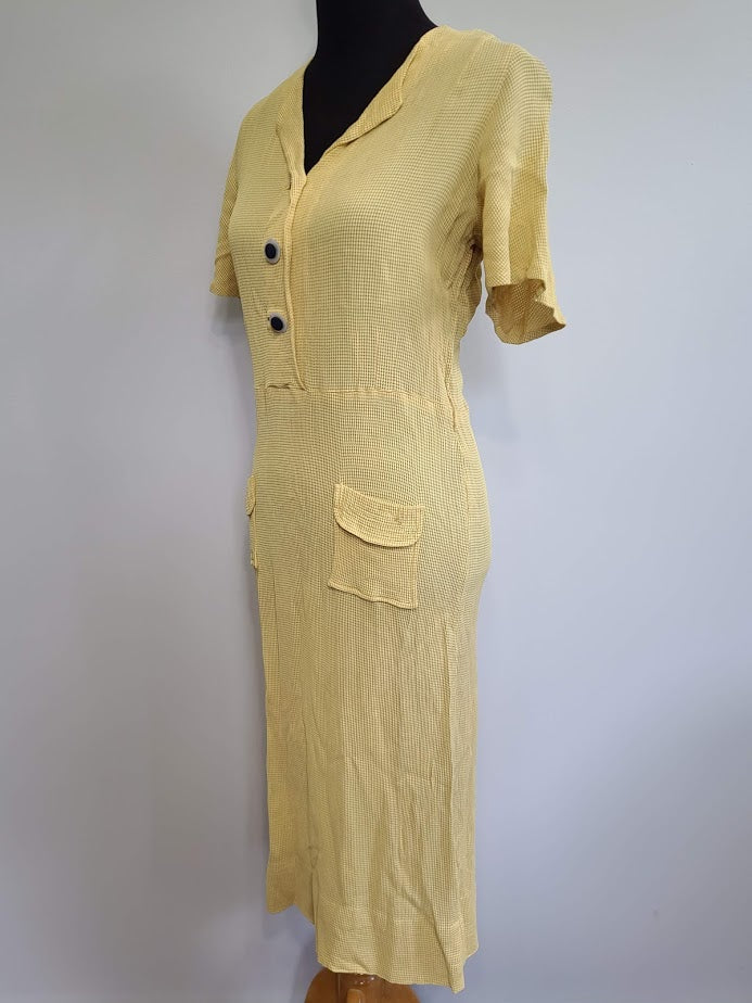 Length - 45"The material has some stretch to it. Nice breathable summer fabric. The buttons are not functional and it does not have any openings - it must slip on over your head! Two small pockets. Overall fairly good condition with some fading down the side.